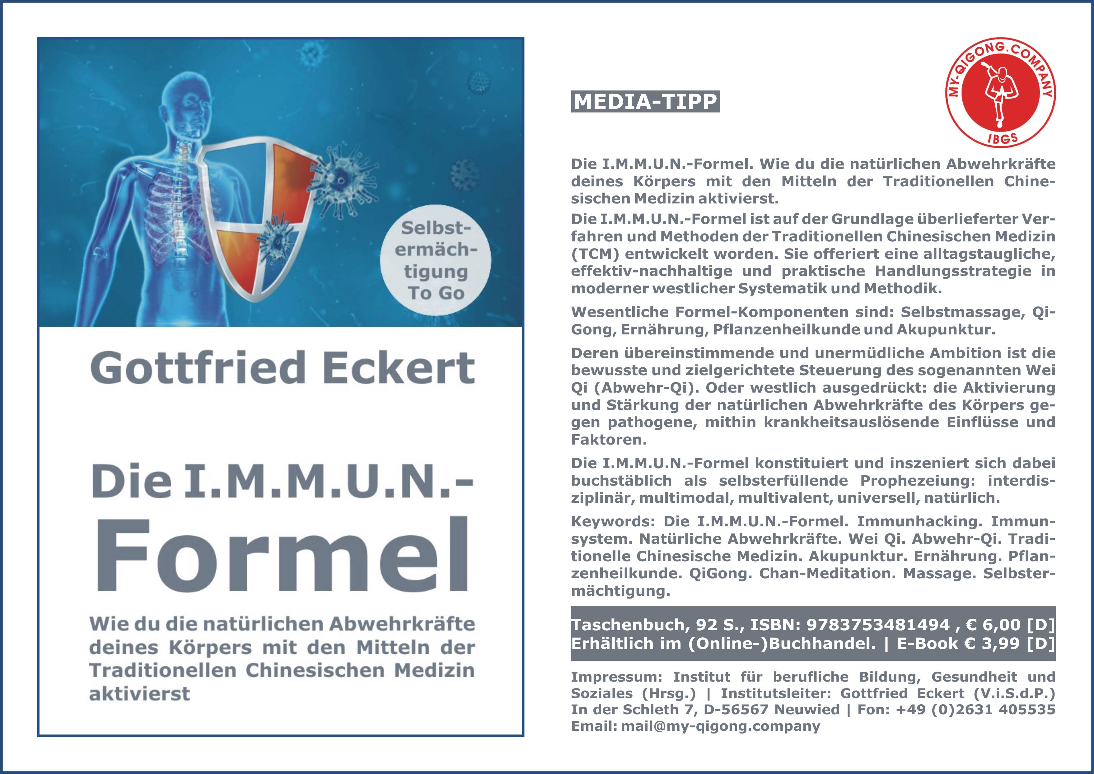 08.07.2025 | Neu als Ebook bei 3TRUST erschienen ... WERBUNG The I.M.M.U.N.E.-Formula. How to activate your body's natural defenses with the tools of Traditional Chinese Medicine. English Edition. Publisher: 3TRUST e.K., In der Schleth 7, D-56567 Neuwied/Germany, Phone: +49 (0)2631 405535, Web: www.3trust-media.com, Email: mail@3trust-media.com. Author: Gottfried Eckert. ASIN: B0CZBG2DLB. Electronic publication, 92 pages. Info |