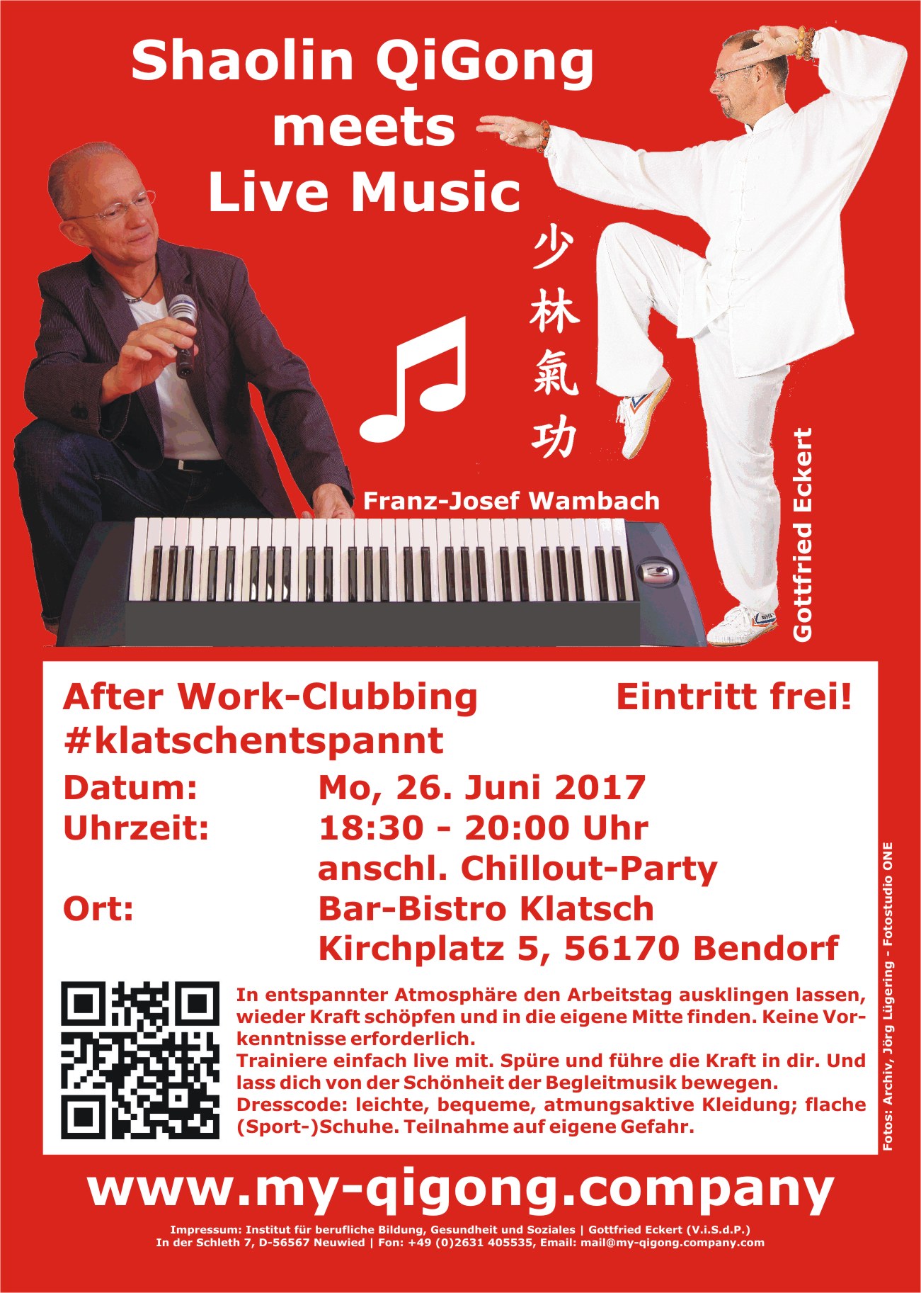 18.04.2017 | Premiere: Shaolin QiGong meets Live Music | von und mit Gottfried Eckert & Franz-Josef Wambach am 26. Juni 2017 im Bistro KLATSCH, Bendorf Info |