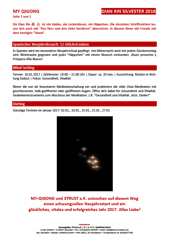 27.12.2016 | Jahresabschluss 2016/Neujahr 2017 Wir wünschen einen schwungvollen Neujahrsstart und ein glückliches, vitales Jahr 2017. Dian Xin |