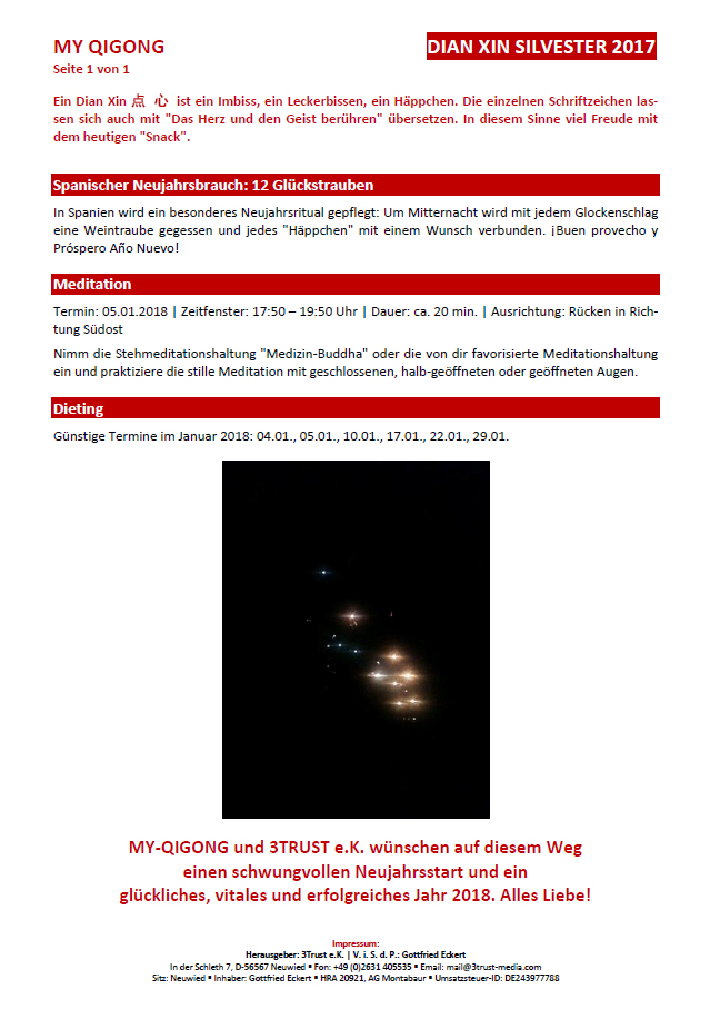 27.12.2017 | Jahreswechsel 2017/2018 Wir wünschen ein glückliches, erfolgreiches und vitales Jahr 2018. Dian Xin |