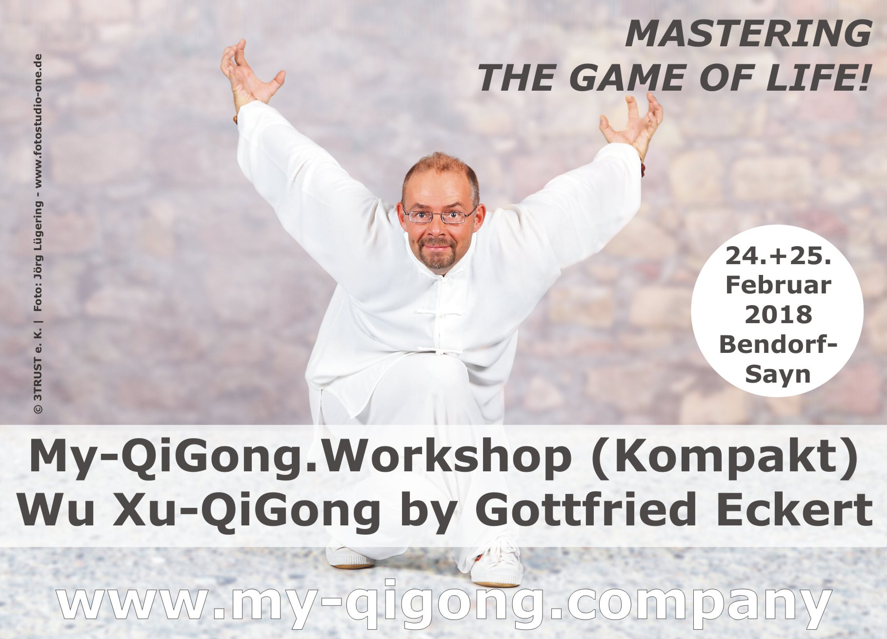 06.02.2018 | PREMIERENVERANSTALTUNG Gottfried Eckert präsentiert erstmalig am 24. und 25. Februar 2018 in Bendorf-Sayn das neue Wu Xu-Qigong im Rahmen des My-QiGong.Workshops (Kompakt). Info-Flyer |