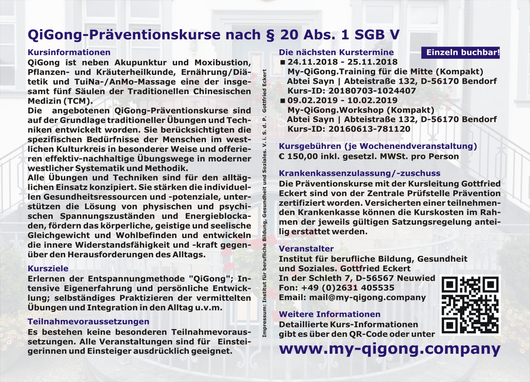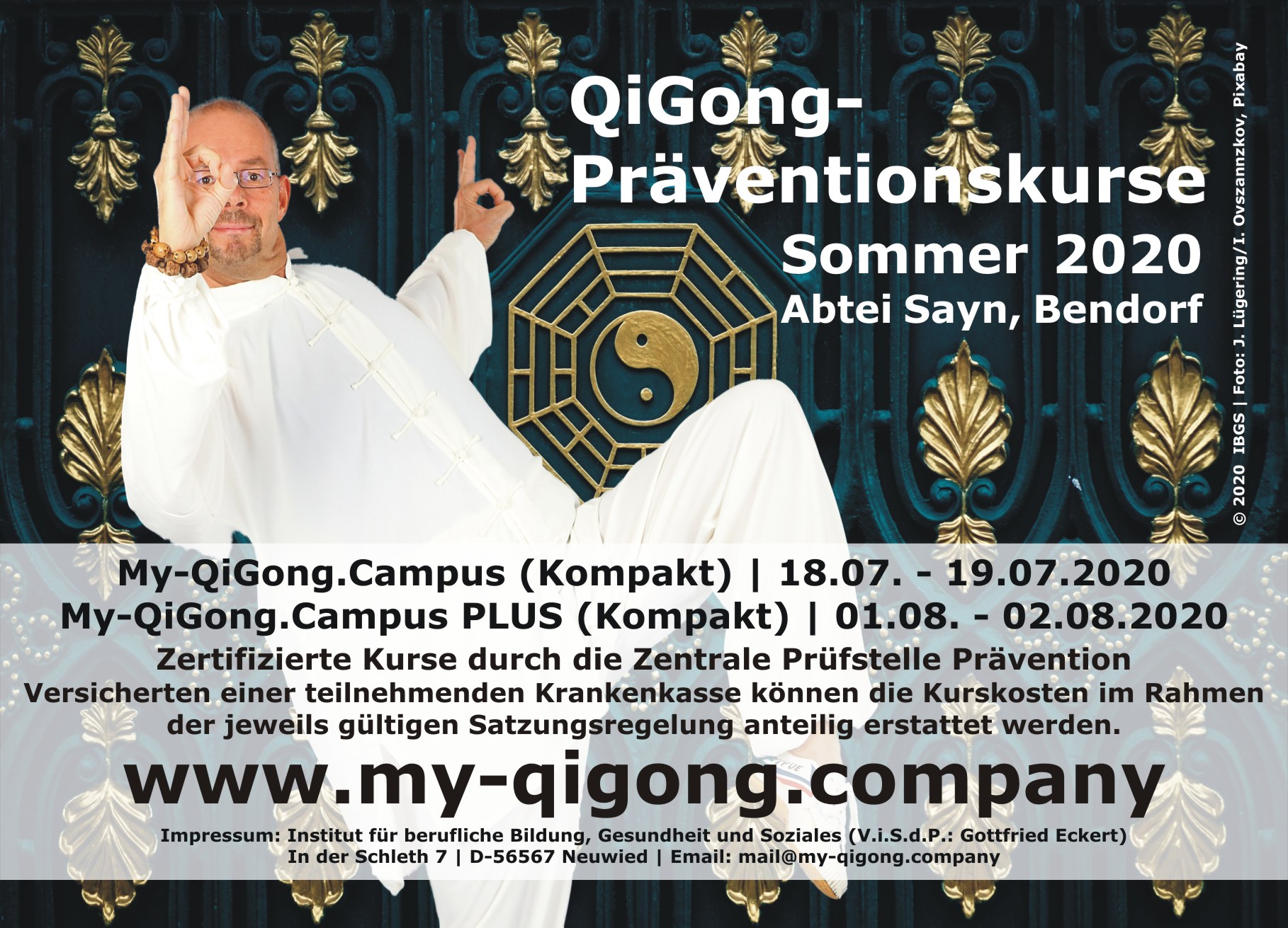 | 22.08.2016 | Shaolin Präventions- und Entspannungs-QiGong in Bendorf-Sayn Am 15. und 16. Oktober 2016 findet in der Abtei Sayn in Bendorf-Sayn ein kompakter QiGong-Präventionskurs für EinsteigerInnen und fortgeschrittene AnwenderInnen statt. Versicherten einer teilnehmenden Krankenkasse können die Kurskosten im Rahmen der jeweils gültigen Satzungsregelung anteilig erstattet werden. Kursinfos gibt es hier. |