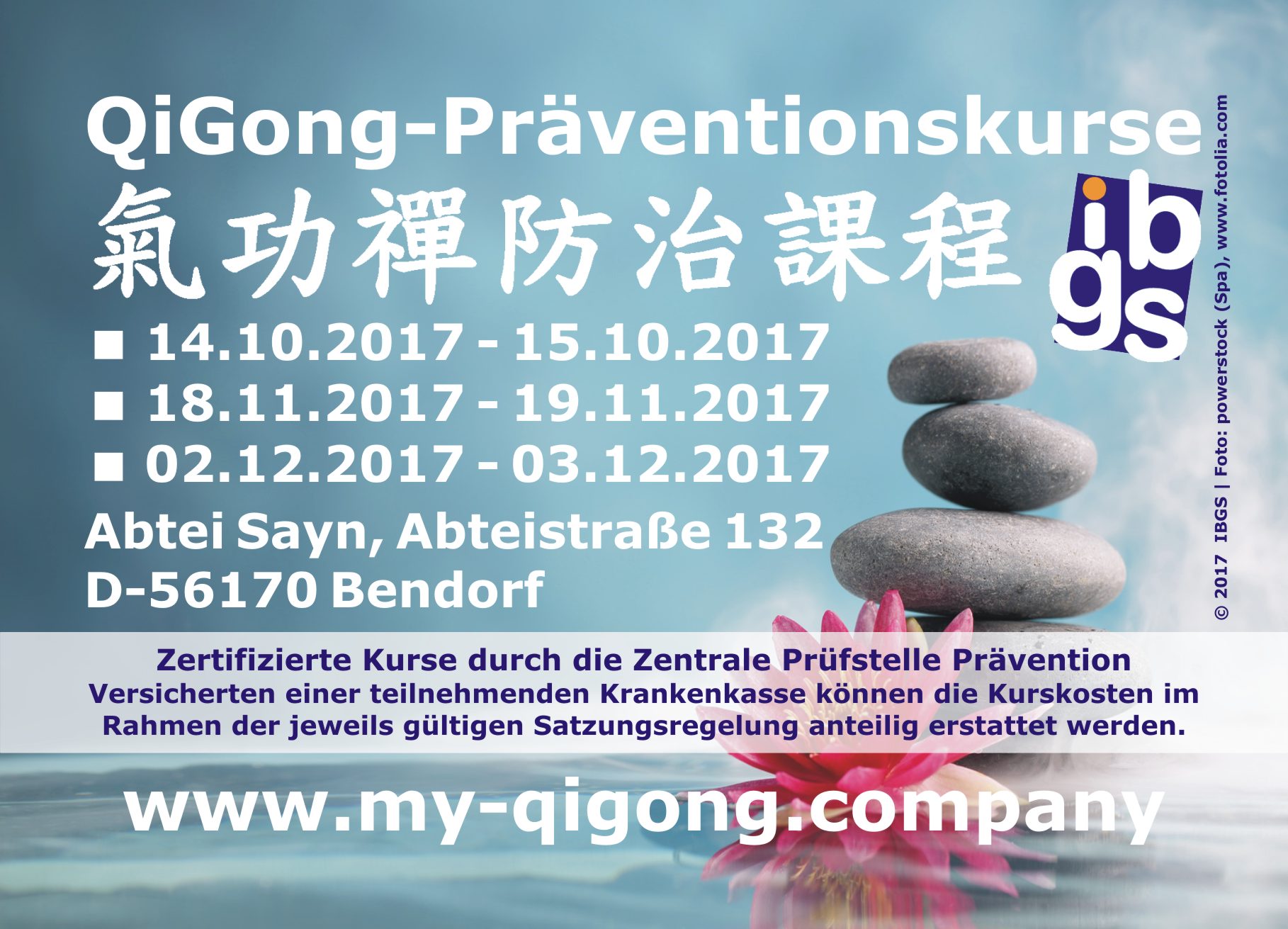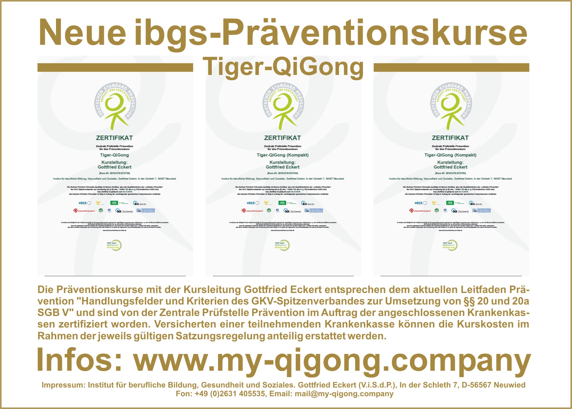 23.12.2016 | Neue ibgs-Präventionskurse Die Präventionskurse "Tiger-QiGong" - Kurs-ID: 20161210-872759, "Tiger-QiGong (Kompakt)" - Kurs-ID: 20161210-872763 und "Tiger-QiGong (Kompakt)" - Kurs-ID: 20161210-872795 mit der Kursleitung Gottfried Eckert entsprechen dem aktuellen Leitfaden Prävention "Handlungsfelder und Kriterien des GKV-Spitzenverbandes zur Umsetzung von §§ 20 und 20a SGB V" und sind von der Zentrale Prüfstelle Prävention im Auftrag der angeschlossenen Krankenkassen zertifiziert worden. Versicherten einer teilnehmenden Krankenkasse können die Kurskosten im Rahmen der jeweils gültigen Satzungsregelung anteilig erstattet werden. Info |