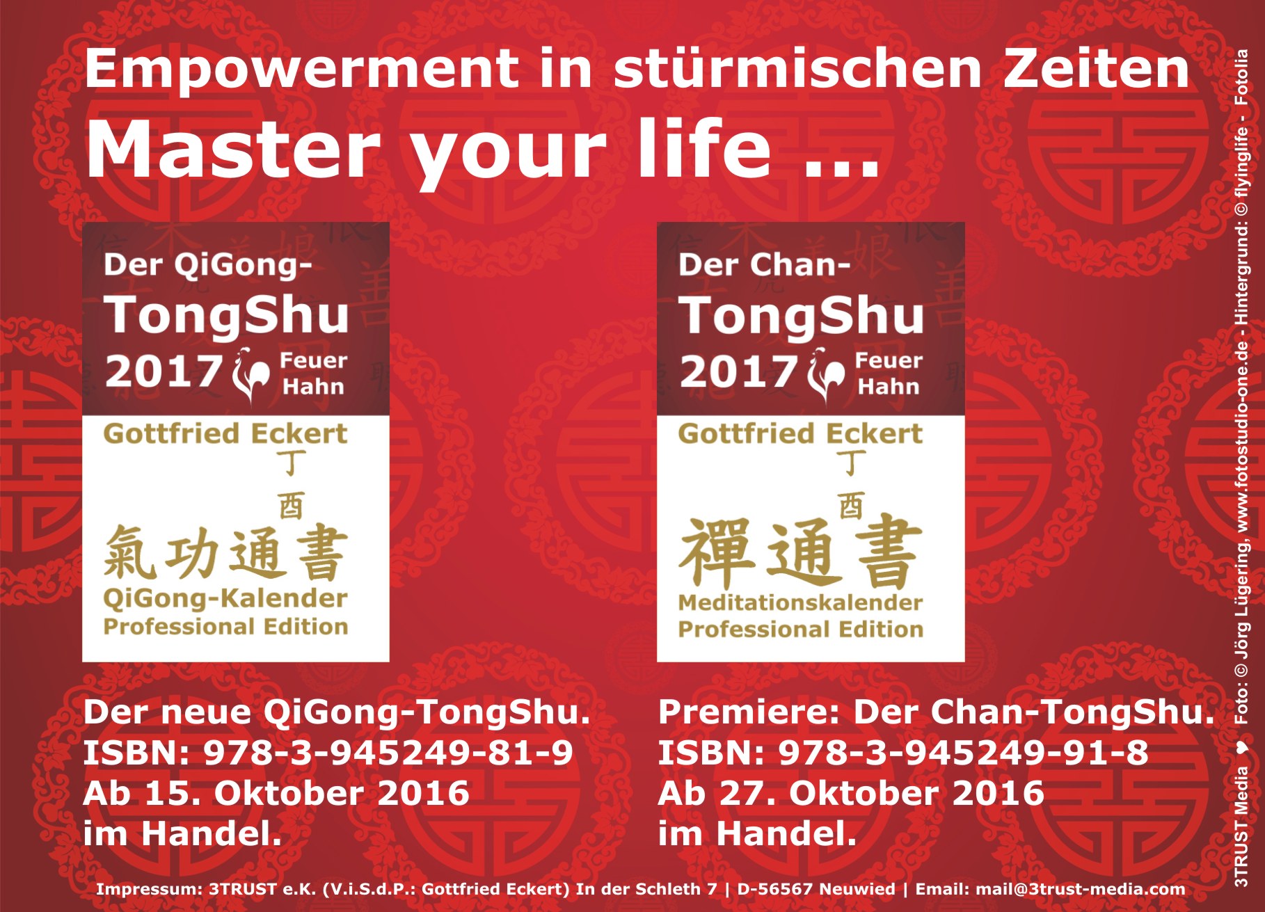 12.09.2018 | Seit 12.09.2018 im Handel ... Der QiGong-TongShu 2019, Autor/Herausgeber: Gottfried Eckert, Verlag: 3TRUST e.K., ISBN: 978-3-945249-83-3, Paperback, 468 Seiten, s/w, 21,0 x 14,8 cm |